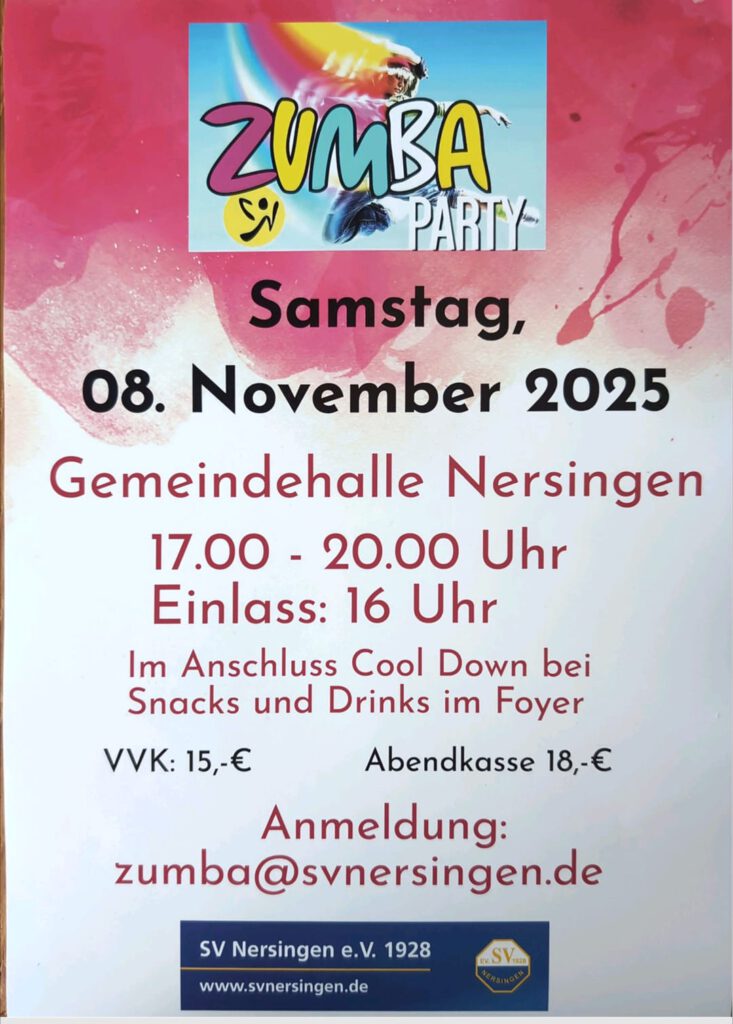 Der große Spaß zum gemeinsamen Auspowern und Feiern bei toller Musik und unter Anleitung unserer zertifizierten Zumba-Coaches kehrt in die Gemeindehalle Nersingen zurück. Zum zweiten Mal steigt am Samstag, 8. November, unsere SVN Zumba Party. Caro und Elena und alle anderen Trainer – man spricht beim Zumba von „Instructor“ – freuen sich auf eure Anmeldungen!